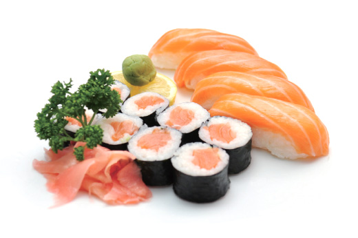 Soupe, salade, riz 4 Sushi saumon, 8 maki saumon
