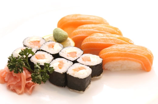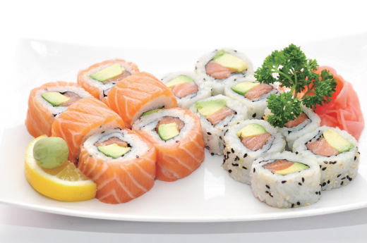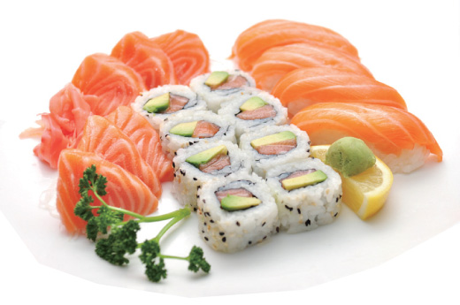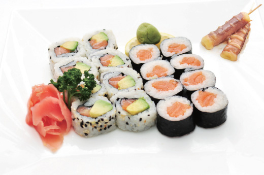 Soupe, salade, riz 6 sashimi saumon, 4 sushi saumon, 8 maki california saumon