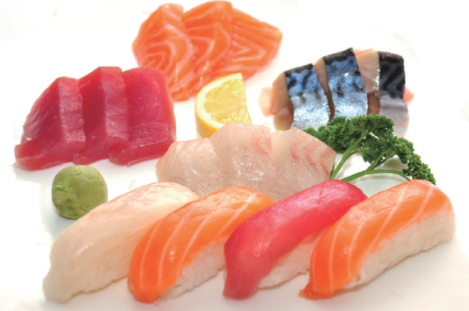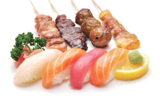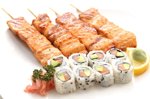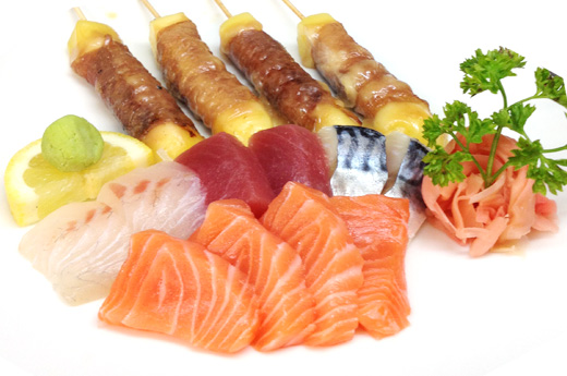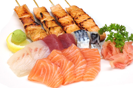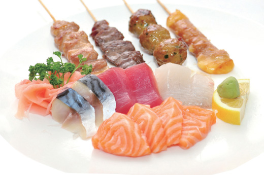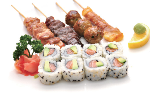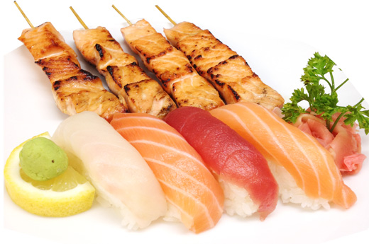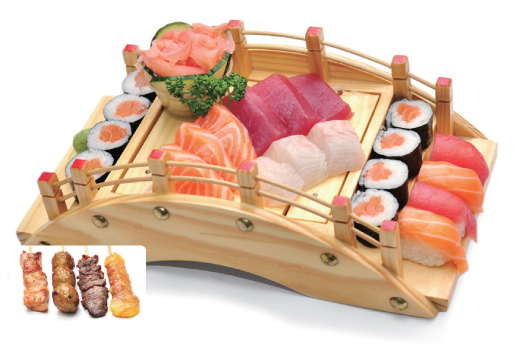 Soupe, salade, riz 2 sushi, 9 sashimi, 8 maki saumon 4 Brochettes: 1 poulet,1 boulette de poulet, 1 boeuf,1 boeuf au fromage
