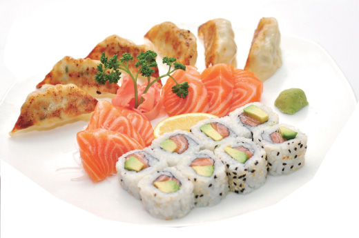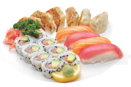 Soupe, salade 4 sushi, 8 maki california saumon, 6 raviolis grillés japonais