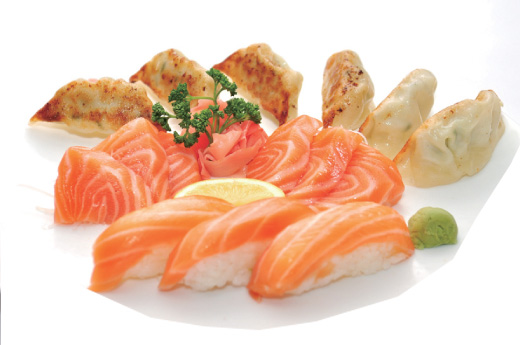 Soupe, salade, riz 3 sushi saumon, 6 sashimi saumon, 6 raviolis grillés japonais