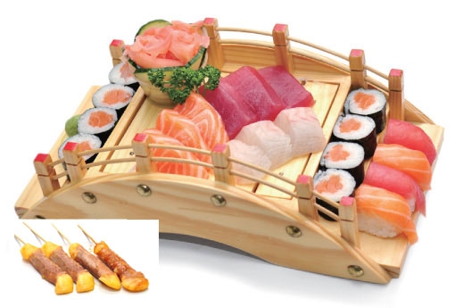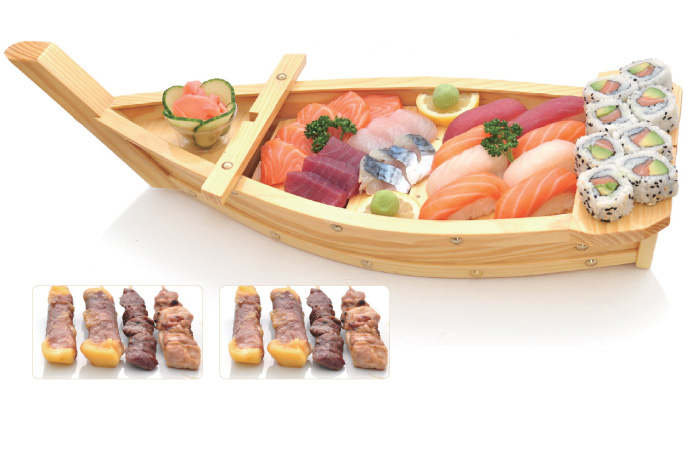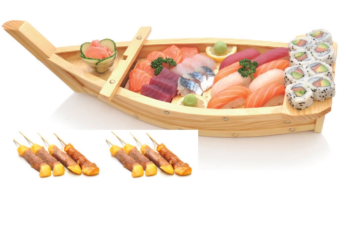 2 soupes, 2 salades, 2 riz 8 sushi, 14 sashimi, 8 maki california 8 Brochettes: 2 poulet, 2 boeuf, 4 boeuf au fromage