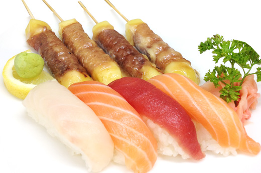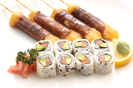 Soupe, salade, riz 4 Sushi assortiment 4 Brochettes: 1 poulet, 1 boulette de poulet 1 boeuf, 1 boeuf au fromage