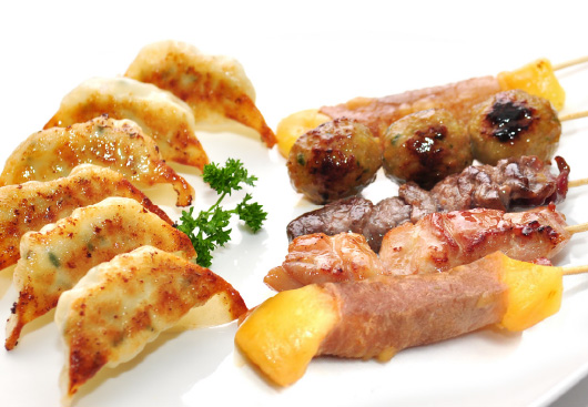 Soupe, salade, riz 6 Raviolis grillés japonais 5 Brochettes: 1 poulet, 1 boulette de poulet, 1 boeuf, 2 boeuf au fromage
